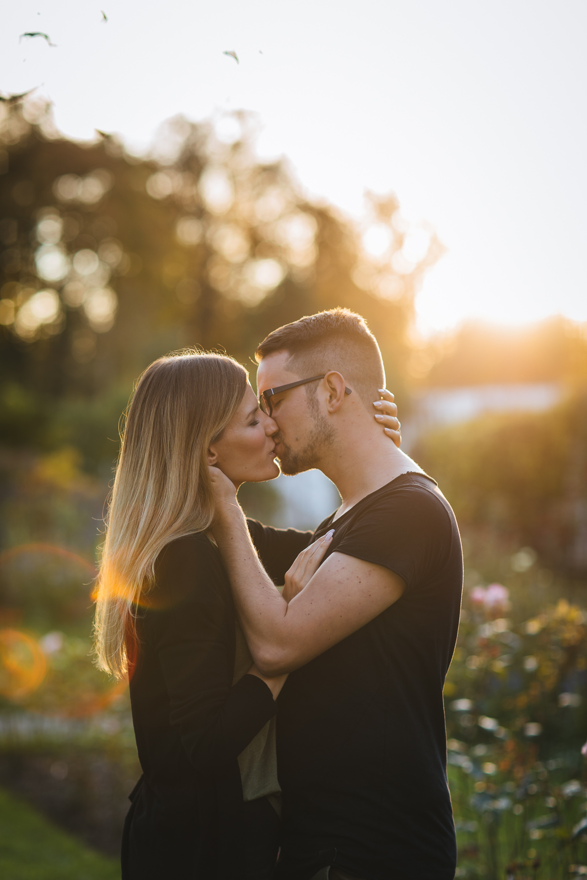 Prinzipiell – bevor ich auf die Uhrzeit eingehe – fotografiere ich die Verlobungsfotos zu jeder Jahreszeit. In meinem Blogbeitrag „4 Gründe für ein Verlobungsshooting“ erzähle ich euch unter anderem, dass ihr die Fotos für eure Save the Date Karten einsetzen könnt. Somit solltet ihr frühzeitig an ein Verlobungsshooting denken, wenn ihr die Fotos für eure Save the Date oder Einladungskarten verwenden möchtet. Ihr heiratet im Sommer und möchtet Anfang des Jahres die Karten versenden? Kein Problem! Seht euch dieses wunderschöne Verlobungsshooting am Wallberg an – die Fotos entstanden im Februar und das Brautpaar heiratet im Herbst. Weiter unten auf dieser Seite seht ihr weitere, wunderbare Verlobungsshootings. Nun aber zur Tageszeit: Grundsätzlich gilt, in der Mittagssonne steht die Sonne am höchsten, wie auch bei den Hochzeitsportraits sollten wir hier möglichst keine Portraits fotografieren. Zu jeder Jahreszeit gibt es einen wunderschönen Sonnenuntergang in den Abendstunden. Daher empfehle ich (wenn es zeitlich machbar ist) die Abendstunden zu favorisieren. Tiefstehende Sonne bringt immer ein sensationelles Licht und eine wunderschöne Atmosphäre mit sich. Wir fangen jedoch nicht erst zur goldenen Stunde an, sondern natürlich früher, sodass wir genügend Zeit zum Quatschen und Fotografieren haben.