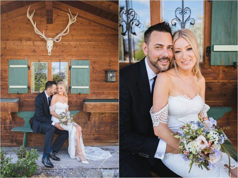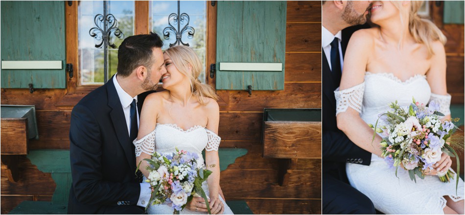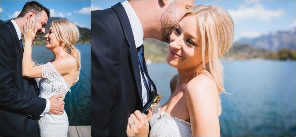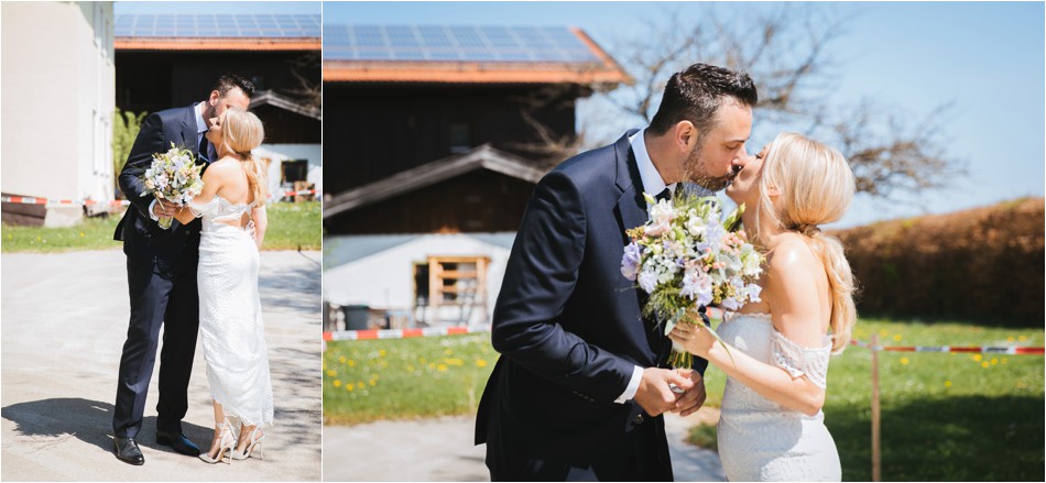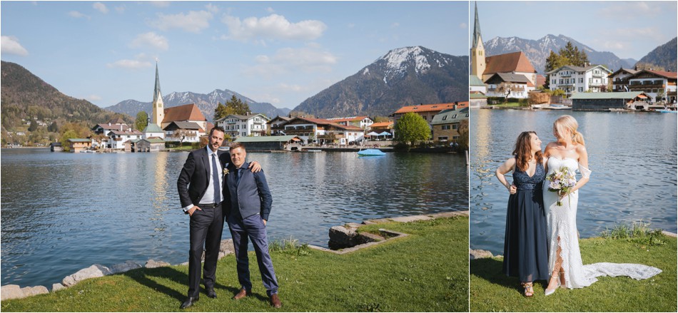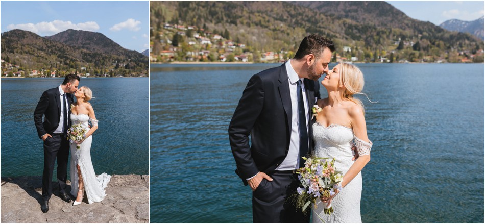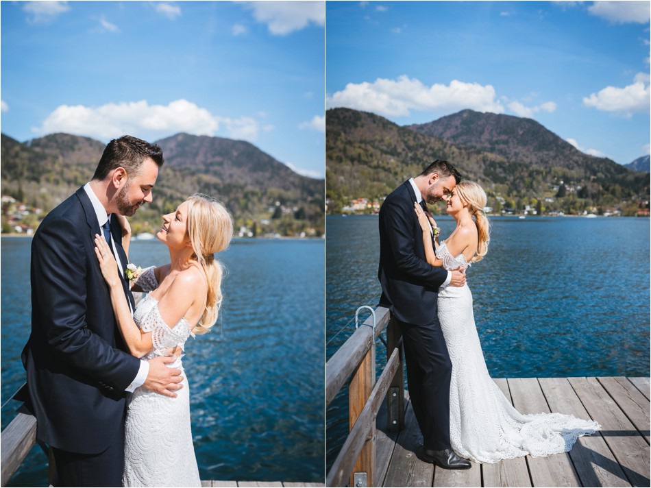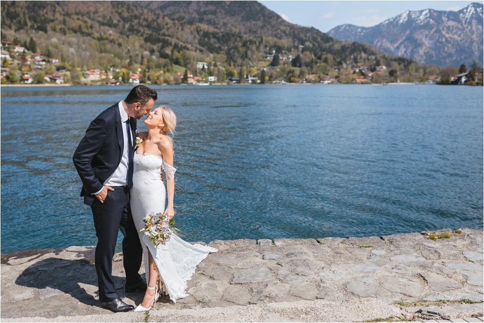 Man spürte den Frühling und roch schon den Sommer, der uns dieses Jahr bevor stand. Im Malerwinkel Tegernsee angekommen, erwartete uns bereits das superleckere Essen und ein kleiner Empfang. Im Anschluss daran hatten die Gäste Zeit ein wenig zu entspannen und einzuchecken, währenddessen wir die mit den Brautpaarfotos begonnen. Nach einer kleinen Familien-Fotosession und anschließendem Kuchenanschnitt war für mich meine Zeit auch schon wieder vorbei. Am Ende kam Polly – sie musste natürlich auch noch auf das ein oder andere Foto.