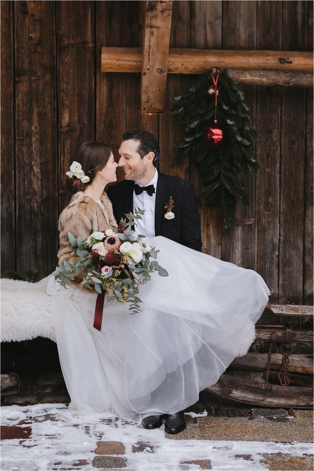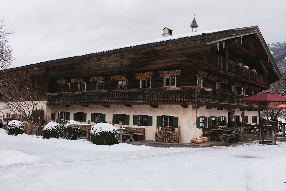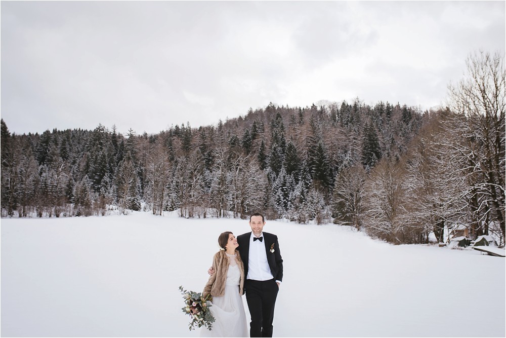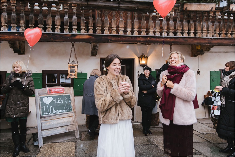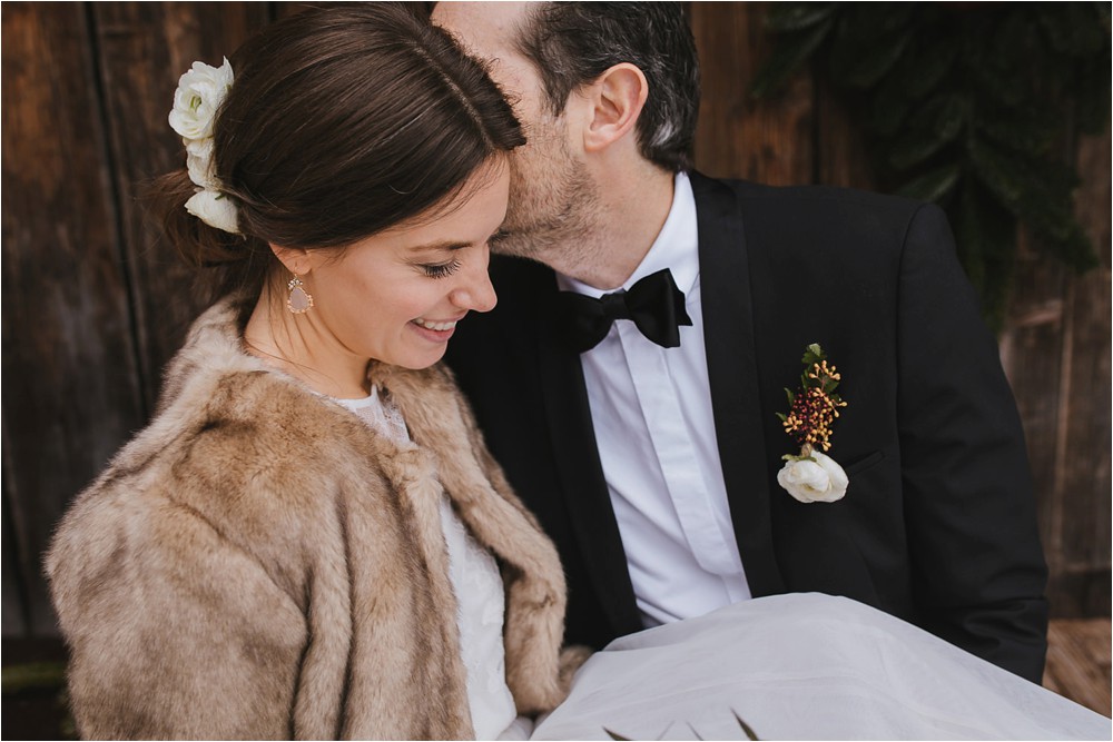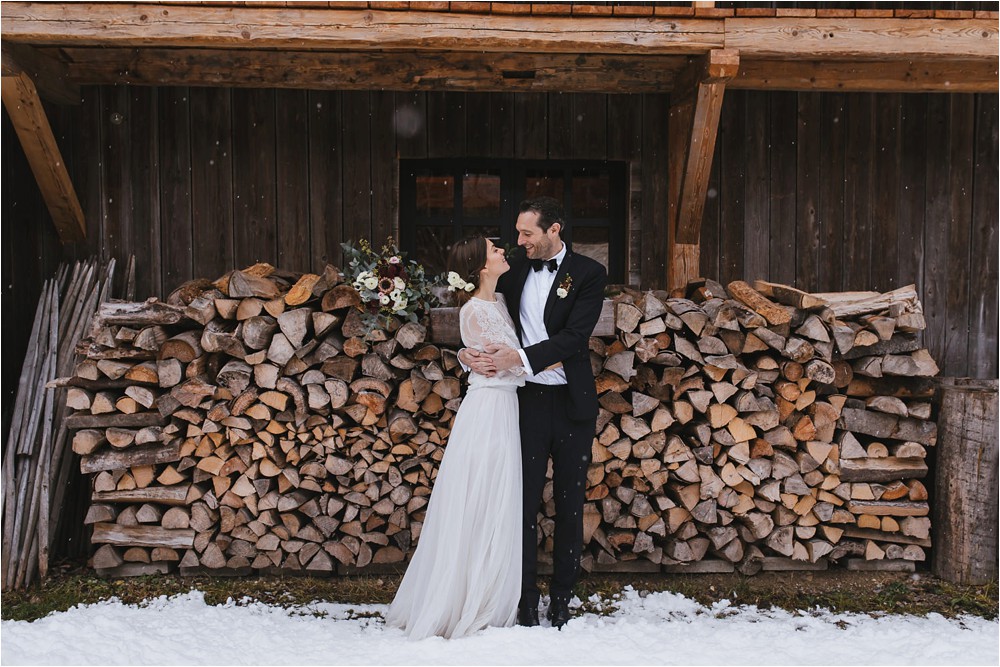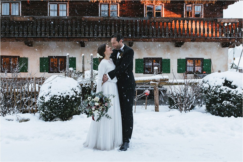 Der Nachmittag mit Kaffee und Kuchen in der Stub’n im schönen Hasenöhrl-Hof ist in vollem Gange. Meine gebuchte Zeit ist gleich vorbei, da fragte ich noch mein Brautpaar „Wollen wir noch ganz kurz ein paar Portraitfotos mit dem weißen Pulli machen?“ Es ist kalt draußen und die Dämmerung setzte allmählich bereits ein. Nach kurzer Überlegung hat sich meine Braut kurzerhand ihren Pullover mitsamt Brautstrauß geschnappt und wir sind raus. Raus in die Kälte, raus in die Stille und in die Dämmerung. Die Lichter vom Hasenöhrl-Hof leuchten. Die Kulisse des Hasenöhrl-Hofes ist traumhaft, man muss gar nicht weit laufen. Es war ruhig, man hörte nichts außer dem Knistern des Schnees unter unseren Füßen. Und da standen sie nun. Innig beieinander. Nur mein Brautpaar mit ganz viel Liebe zwischen den beiden und tausend tanzender Schneeflocken. Eine romantische, extravagante und traumhaft schöne Winterhochzeit im Hasenöhrl Hof.