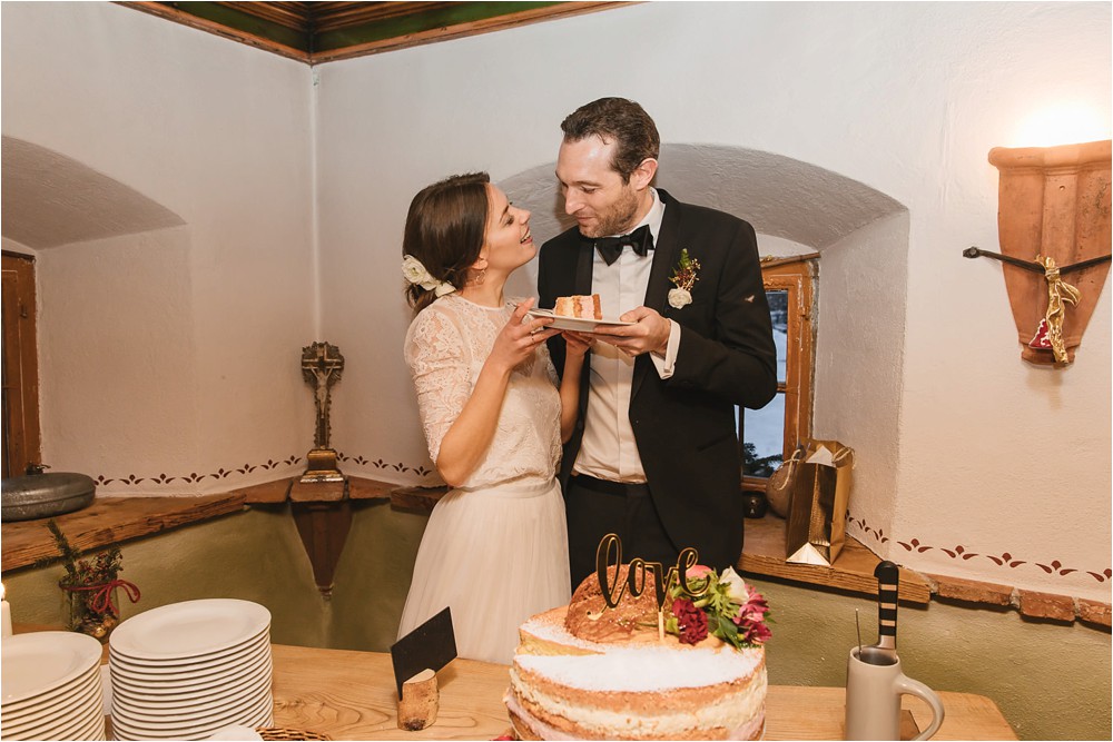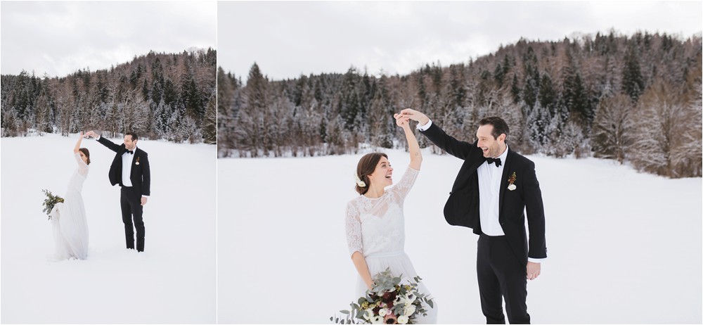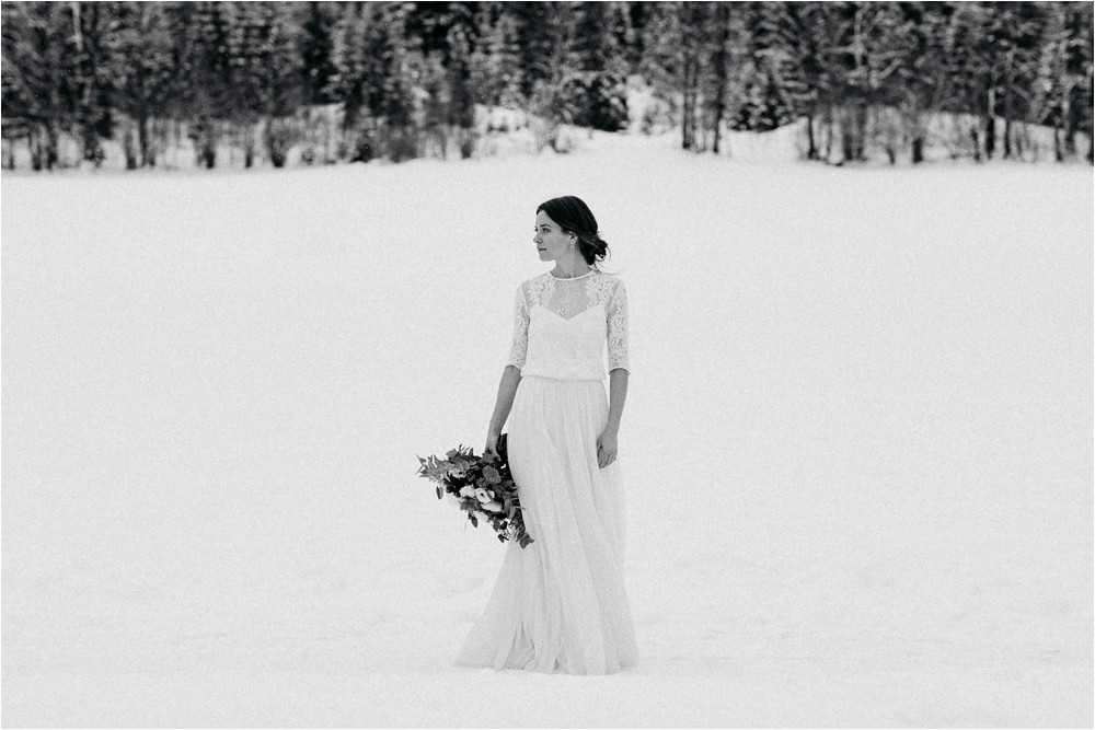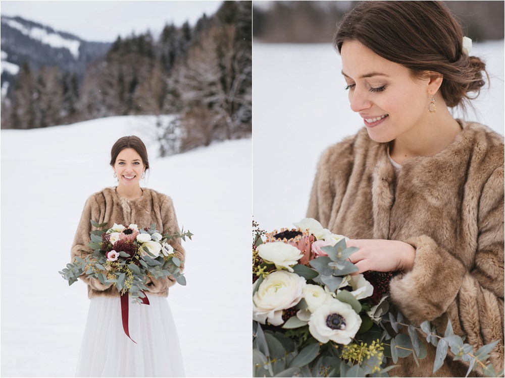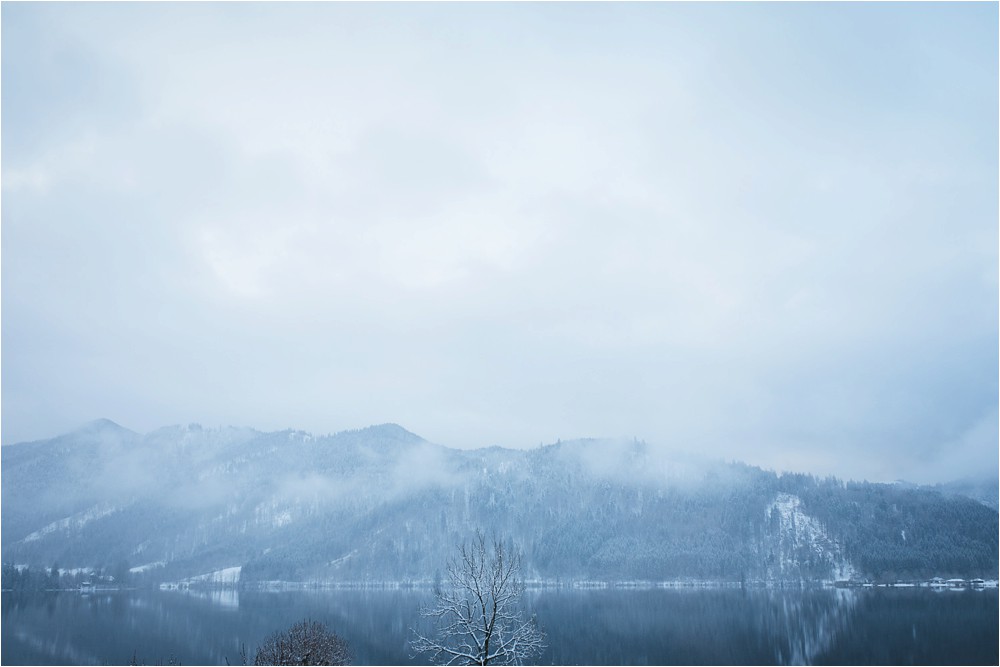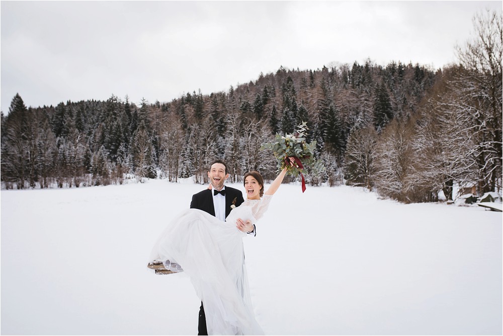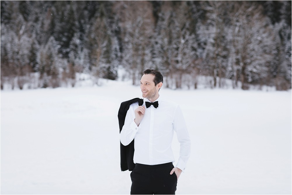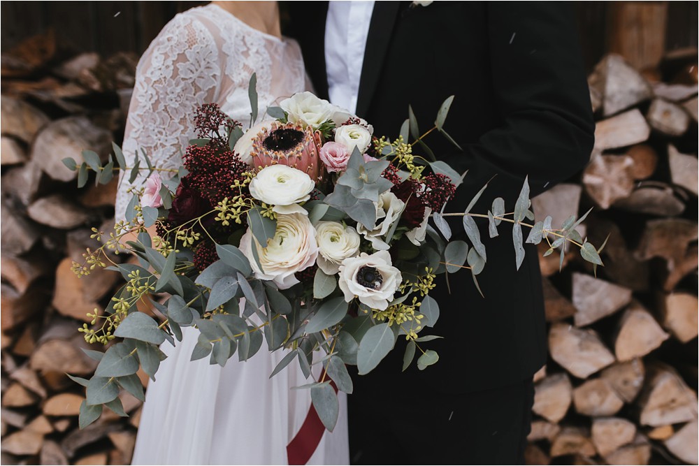 Der Nachmittag mit Kaffee und Kuchen in der Stub’n im schönen Hasenöhrl-Hof ist in vollem Gange. Meine gebuchte Zeit ist gleich vorbei, da fragte ich noch mein Brautpaar „Wollen wir noch ganz kurz ein paar Portraitfotos mit dem weißen Pulli machen?“ Es ist kalt draußen und die Dämmerung setzte allmählich bereits ein. Nach kurzer Überlegung hat sich meine Braut kurzerhand ihren Pullover mitsamt Brautstrauß geschnappt und wir sind raus. Raus in die Kälte, raus in die Stille und in die Dämmerung. Die Lichter vom Hasenöhrl-Hof leuchten. Die Kulisse des Hasenöhrl-Hofes ist traumhaft, man muss gar nicht weit laufen. Es war ruhig, man hörte nichts außer dem Knistern des Schnees unter unseren Füßen. Und da standen sie nun. Innig beieinander. Nur mein Brautpaar mit ganz viel Liebe zwischen den beiden und tausend tanzender Schneeflocken. Eine romantische, extravagante und traumhaft schöne Winterhochzeit im Hasenöhrl Hof.