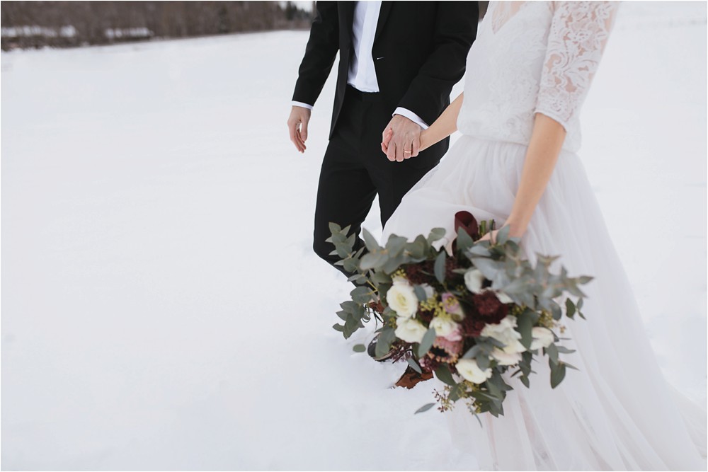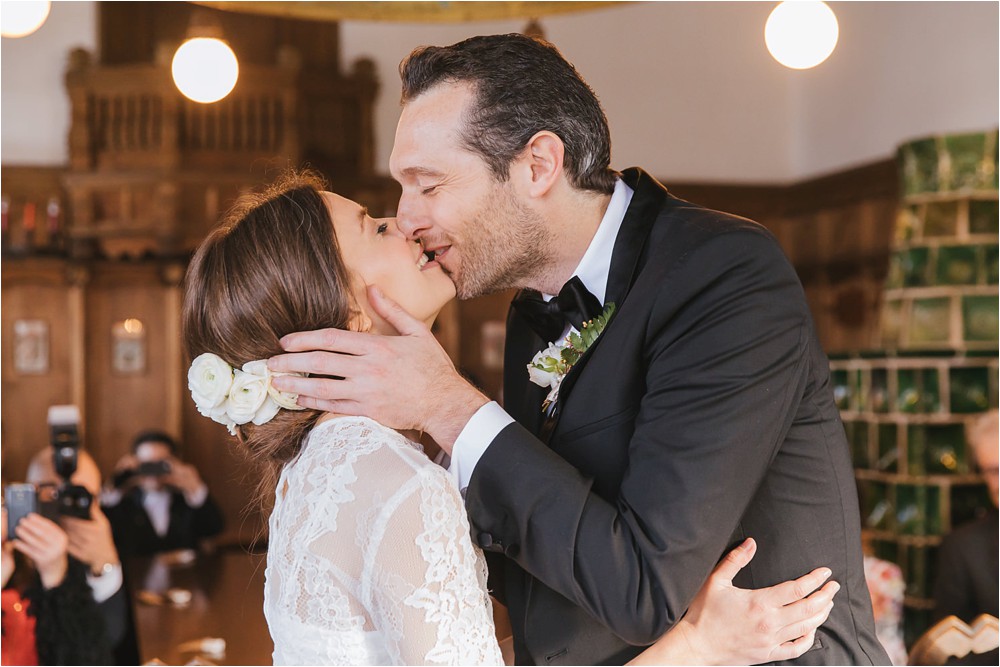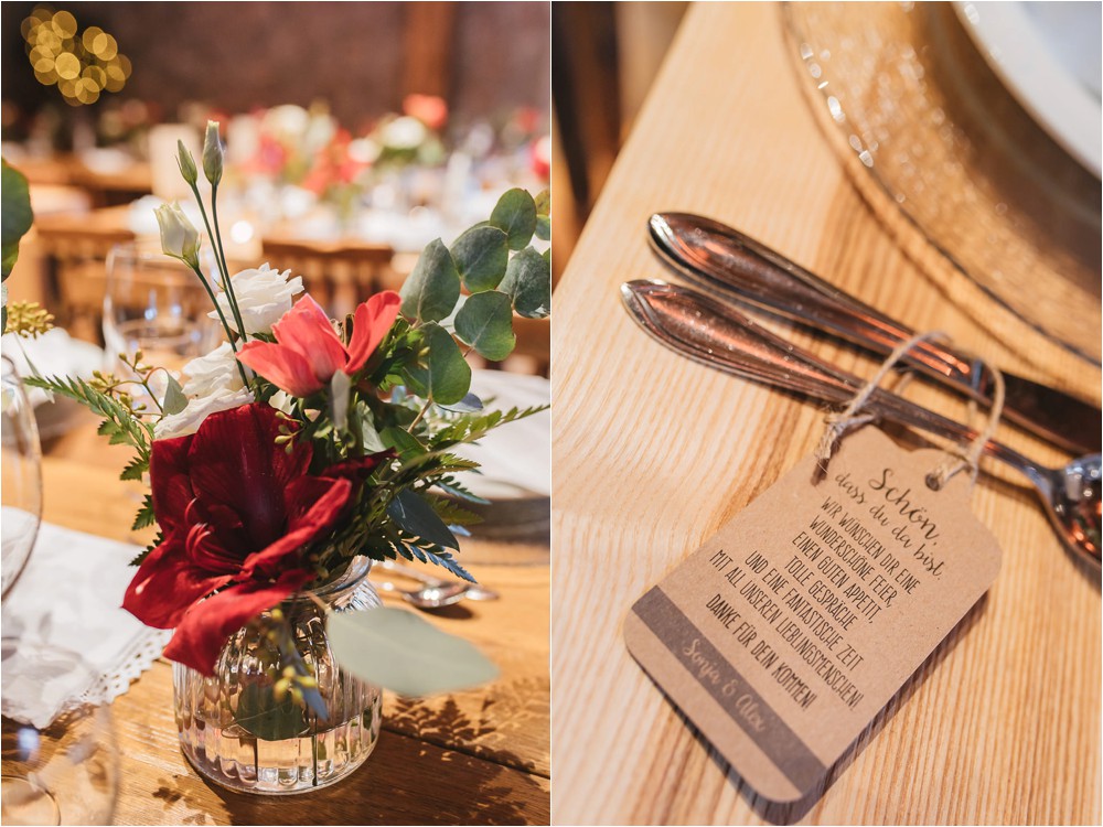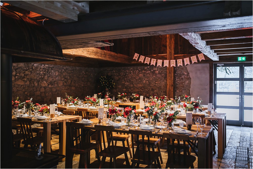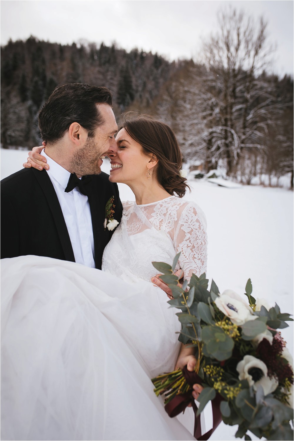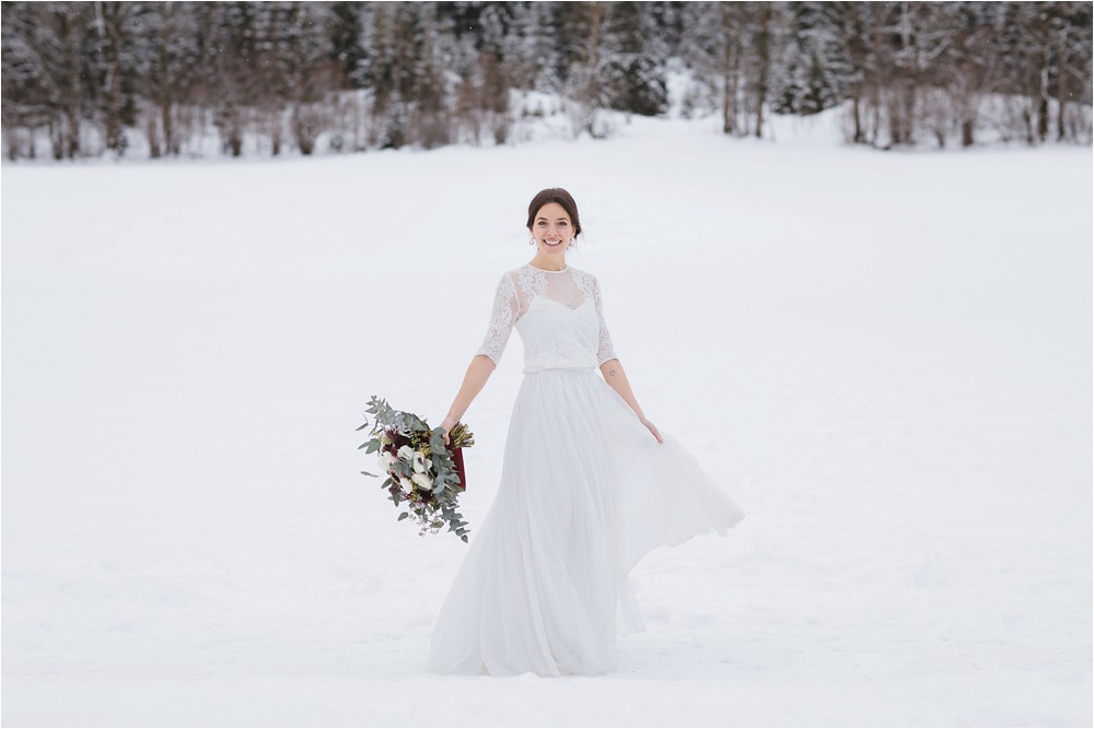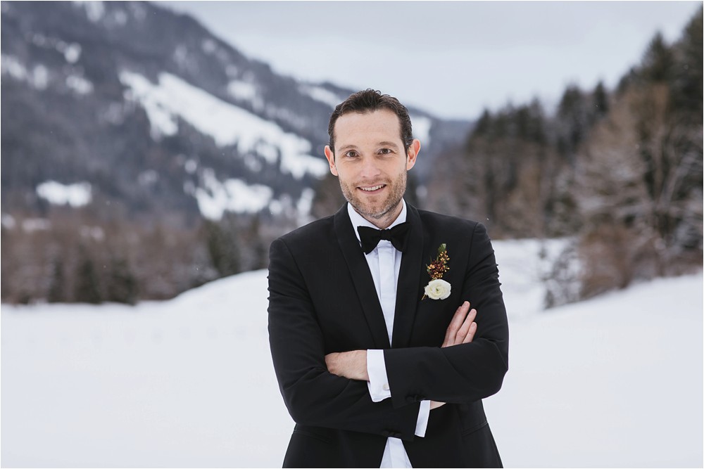 Der Nachmittag mit Kaffee und Kuchen in der Stub’n im schönen Hasenöhrl-Hof ist in vollem Gange. Meine gebuchte Zeit ist gleich vorbei, da fragte ich noch mein Brautpaar „Wollen wir noch ganz kurz ein paar Portraitfotos mit dem weißen Pulli machen?“ Es ist kalt draußen und die Dämmerung setzte allmählich bereits ein. Nach kurzer Überlegung hat sich meine Braut kurzerhand ihren Pullover mitsamt Brautstrauß geschnappt und wir sind raus. Raus in die Kälte, raus in die Stille und in die Dämmerung. Die Lichter vom Hasenöhrl-Hof leuchten. Die Kulisse des Hasenöhrl-Hofes ist traumhaft, man muss gar nicht weit laufen. Es war ruhig, man hörte nichts außer dem Knistern des Schnees unter unseren Füßen. Und da standen sie nun. Innig beieinander. Nur mein Brautpaar mit ganz viel Liebe zwischen den beiden und tausend tanzender Schneeflocken. Eine romantische, extravagante und traumhaft schöne Winterhochzeit im Hasenöhrl Hof.